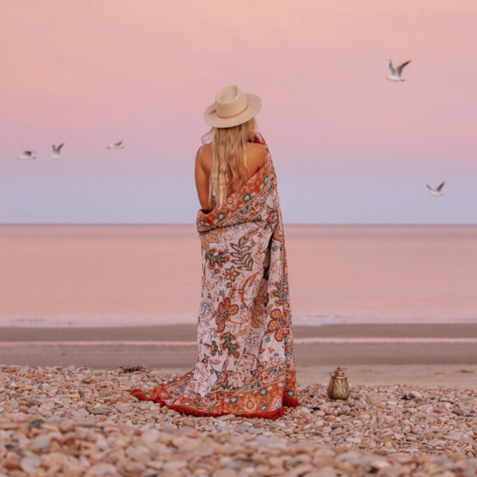 The warm bohemian design of our Willow features earthy tones set against a sandy backdrop. Creams, browns and green are delicately woven with 100% cotton creating a durable, soft picnic throw. The Willow is the perfect garden or beach blanket to adorn a picnic with friends and loved ones.